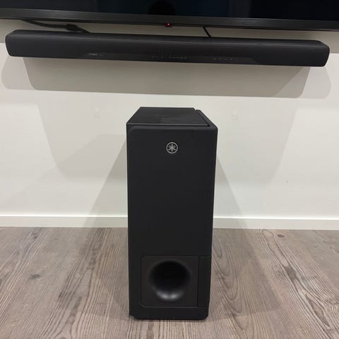 Yamaha YST-SW012 subwoofer, jossa on ruskea kotelo. Teho 45 wattia.