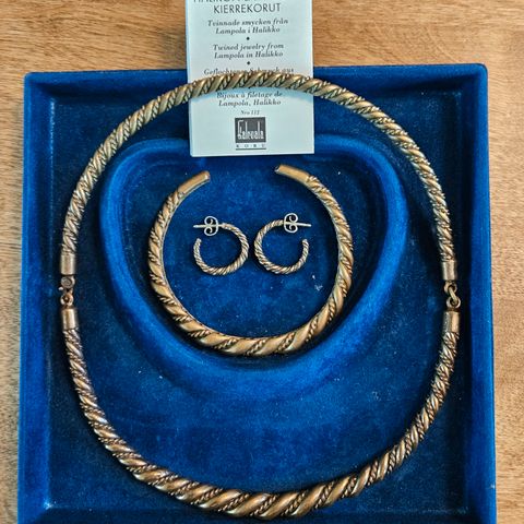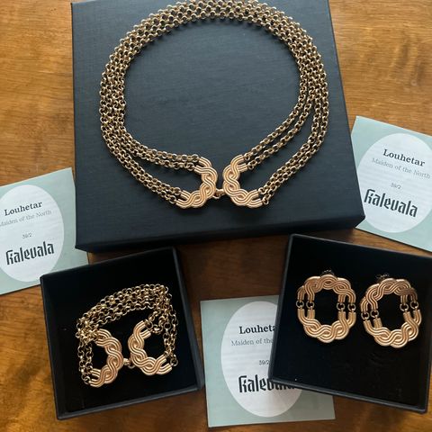 Myydään Kalevala Korun Taru Harmaalan suunnitelema Louhetar-setti, pronssia. Itsellä jääneet kokonaan käyttämättä, eli ovat uudet ja virheettömät, vuonna 2021 ostettu.