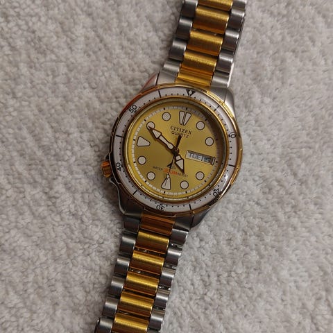 Myydään juuri huollettu 30-vuotias sukelluskello keräilijälle tai vaikka arkikäyttöön. Olen ostanut sen uutena 1995 tai 1996. Painetestiä ei tehty huollossa kun ei ollut enää käyttöä sukeltamisessa tietokoneiden korvattua tällaiset. Ranneke on vaihdettu jokin aika sitten ja on uuden veroinen ja alkuperäinen varaosa.