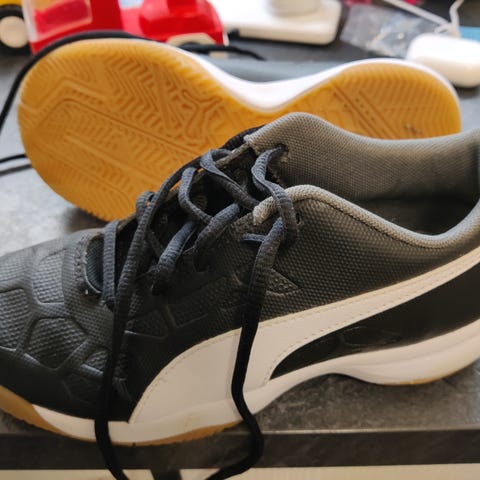 Puma sisäpelikengät, koko 33. Käytetty lähinnä pallohallissa, mutta myös sinne siirryttäessä. Kengän nauhat korvattu säädettävällä kuminauhalla.