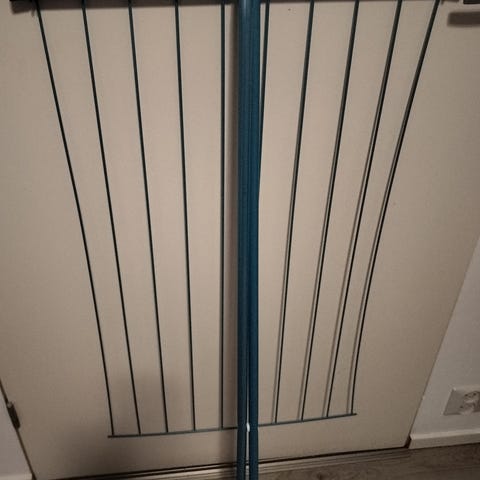 Myydään Sinin kuivausteline, jonka sivusiivet saa levitettyä. Telineessä yksi ripustustanko rikki (kts.kuva 3). Muuten hyväkuntoinen, ei vikoja.