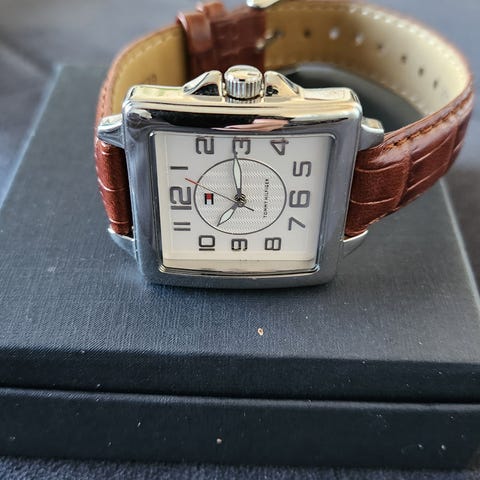 Erittäin vähällä käytöllä ollut, virheetön, kullan värinen, ruskealla krokotiilin nahkarannekkeella. Halkaisija 47 mm, vesitiivis.