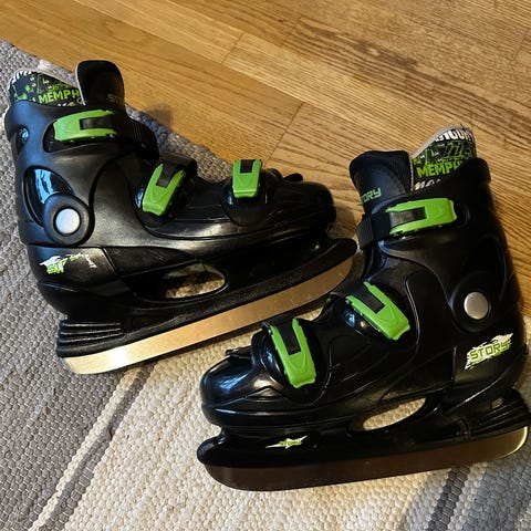 Vähän käytetyt unisex luistimet. Merkki: Story. Ovat olleet käytössä koulun luistelutunneilla pojallani, jolle nauhojen solmiminen on vaikeaa. Nämä luistimet saa helposti kiristettyä ja ne ovat tulevat jalassa. Koko vastaa mielestäni hyvin annettua kokoa. Sisävuoren voi irroittaa ja tarvittaessa pestä.