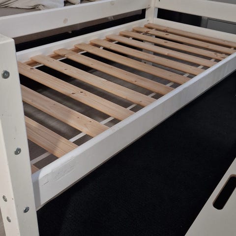 Liisa pieni kerrossänky 70x155, kuvassa toinen kokonaisuuden sängyistä. Kerrossänky kokonaisuuteen kuuluu kuvassa näkyviä sänkyjä 2kpl, molempiin lisäturvalaidat, tikkaat ja Ikean patjat saa myös mukaan. Voi siis käyttää kerrossänkynä sekä kahtena erillisenä sänkynä. Pieniä käytönjälkiä löytyy, mutta siisti vielä seuraavaan kotiin. Vekeltä ostettu uutena meille.
