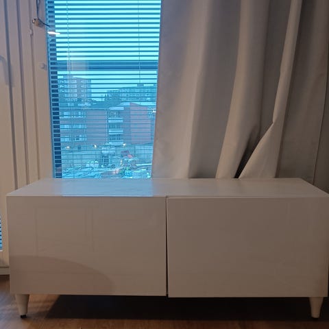 Pitkä TV taso joka koostuu kahdesta erillisestä Ikea bestå sarjan 120cm leveästä rungosta jotka ei ole kiinnitetty toisiinsa. Rungot valkoiset, ovet kiiltävän valkoiset. Yksi irrotettava hylly sisällä kummassakin rungossa, eli yksi kaappi jää ilman hyllyä. Normaalit ovet saranoilla. Tason pituus kokonaisuudessaan 240cm, korkeus 38cm, syvyys 42cm. Pienet jalat/tassut runkojen pohjassa. Ei näkyviä käytön jälkiä päällepäin.