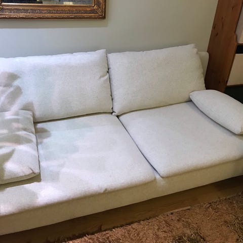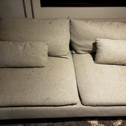 Sohva on täydellinen perus arkeen sekä sopii erinomaisesti myös lemmikkitalouteen, sillä päälliset voi helposti pestä tai vaihtaa uusiin väreihin eli pysyy siistinä ja raikkaana! Sohvassa on pieniä kissan kynsimä jälkiä sohvan alhaalla.