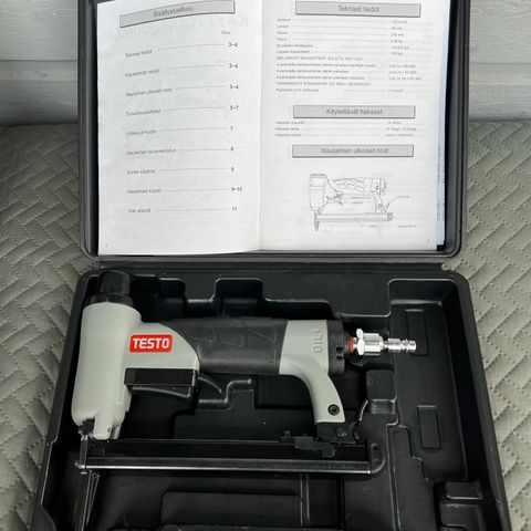 Paineilmatoiminen hakasnaulain. Todella vähän käytetty tarpeettomana. Hakaspaketit mukaan. Koko selkä 26,5 mm pituus 20 mm noin 9000 kpl, 26,5 mm pituus 38 mm noin 9000 kpl.