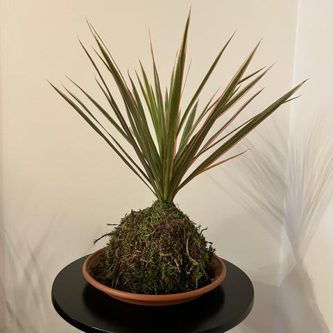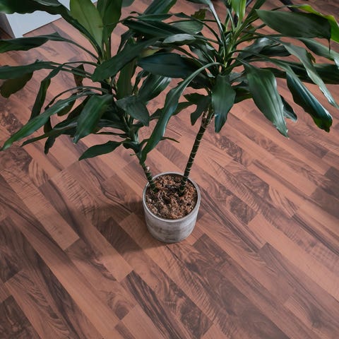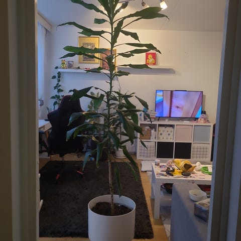 Koti keinotekoinen viherkasvi, joka on sijoitettu punotun korin sisään. Kasvin lehdet ovat vihreät ja se soveltuu sisustuselementiksi erilaisiin tiloihin. Kasvin korkeus on noin 150 cm.