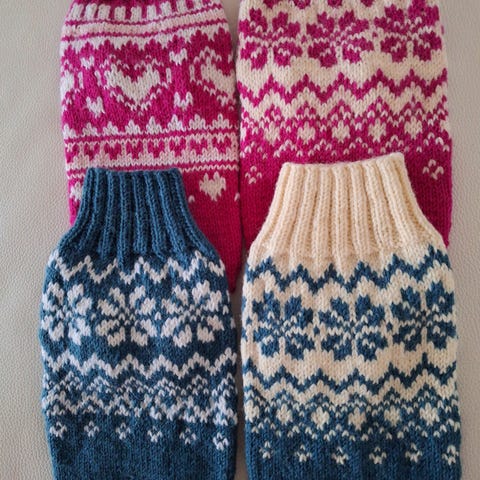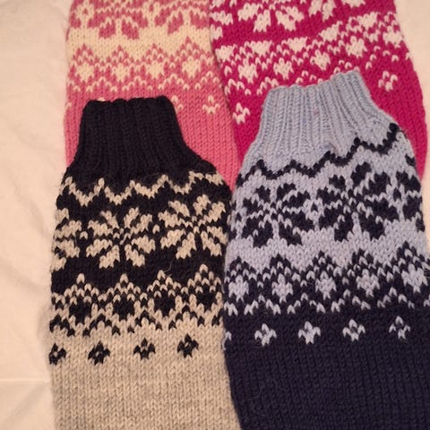 7-veljestä langasta käsityönä neulottu koiran villapaita. Ympärysmitta näissä kaikissa on n.27cm, pituus niskasta n.23cm ja lisäksi kaulus n.6cm.