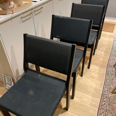 Neljä kappaletta Artekin 611 tuoleja. Tuolit ovat rungoiltaan tukevia ja ehjiä. Lakkapinnoissa on pintavaurioita ja verhoilussa on useita tahroja ja hieman maalia. Tuoleissa ei ole Artekin leimoja tai tarroja.