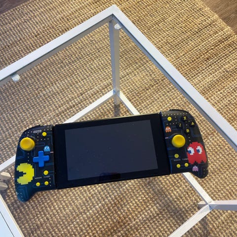Nintendo Switch pelikonsoli sininen ja punainen Joy-Con -ohjaimilla. Mukana neljä peliä: Mario Kart 8 Deluxe, Super Smash Bros. Ultimate, Animal Crossing: New Horizons ja Five Nights at Freddy's. sekä myös zelda seikkailu peli Paketissa myös konsolin telakka ja virtalähde.
