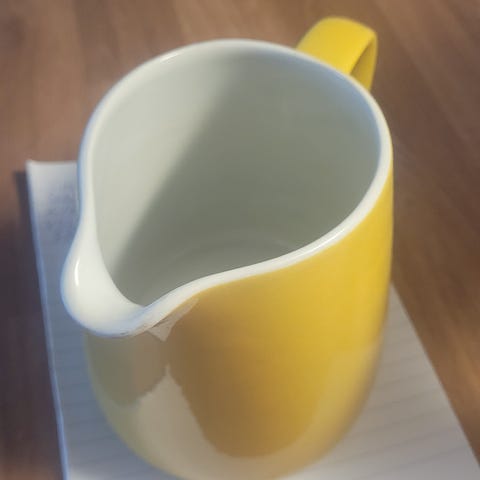 Arabian Perho-sarjan keltainen kannu. Kannun on suunnitellut Birger Kaipiainen. Koristelu oli tuotannossa FA-mallin kannuissa vuosina 1958–1962. Kannun korkeus on 14 cm ja tilavuus 1 litra.