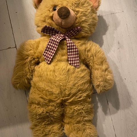Nalle pehmolelu ruskeassa värissä, koristeltu ruudullisilla ruseteilla. Pehmeä materiaali, soveltuu lasten leikkeihin ja koristeeksi.