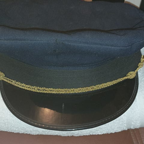 E.R. Wahlman Oy M-lakki, valmistettu Helsingissä. Lakkimalli sisältää mustan lippalakin, ruskean nauhan ja kultaisen koristeellisen köysikoristeen. Sisävuori on mustaa materiaalia, jossa näkyy valmistajan merkintä.