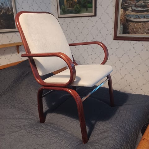 Kuvan tuoli myynnissä. Päällinen on aivan uusi ja tuoli on rakenteeltaan ehjä. Myös pinta on hyvässä kunnossa. Tuoli on 60-luvulta ja koivurunkoinen.
