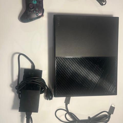 Xbox One pelikonsole mustassa värissä. Sisältää kaksi langatonta ohjainta, mustan ja valkoisen. Sopii Xbox One -pelien pelaamiseen.