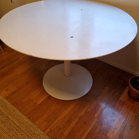 Annetaan kuvan valkoinen Ikea Ingatorp ruokapöytä. Molemmilla puolilla klaffit ja päässä laatikko. Puuta. Kannessa hieman elämisen jälkeä. Maalamalla saa hyvän. Toki menee noinkin.