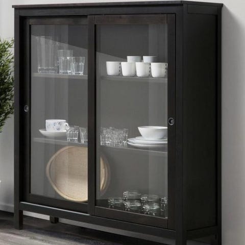 Musta Hemnes hylly joutilaana. Jotain käytön jälkeä on ja tämä huomioitu hinnassa. (Myös alimman tason yksi kannake puuttuu mutta niitähän saa uusia.)