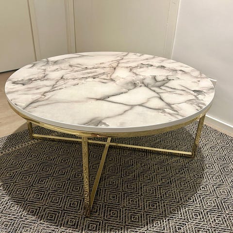 Päällyslevy valkoinen marmorikuviolla. Kauppoihin ei kuulu pöydän päällä olevat koriste-esineet. :)