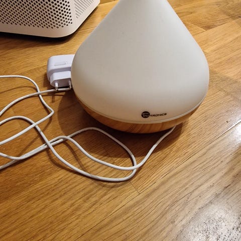 Diffuuserin kanssa käytetty eteerisiä öljyjä ja niistä jäänyt sisälle tuoksuja. Ehjä ja siisti.