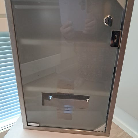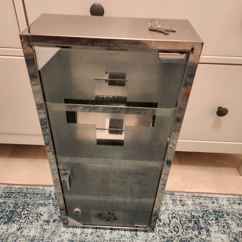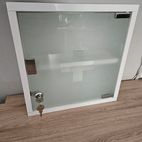 Lääkekekaappi, jossa on valkoinen runko ja läpinäkyvä lasiovi. Kaapissa on avainlukko ja sisähylly. Mitat; 30 x 30 x 12 cm, Tyylikäs, turvallinen malli. Metallia. Hinta 25 euroa. Voin lähettää. Mmm.