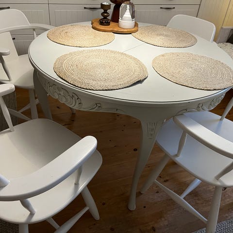 Pyöreä valkoinen puinen ruokapöytä lisäosalla ja 4 tuolia