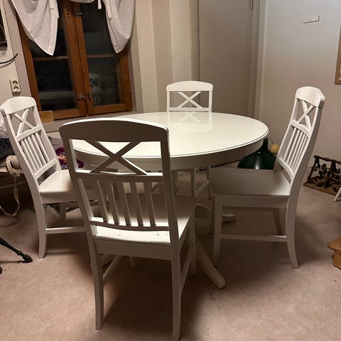 Pyöreä valkoinen puinen ruokapöytä, jossa on lisäosa pöydän jatkamiseen. Pöydässä näkyy kulumaa ja maalipinnan naarmuja. Mukana 4 ruskeaa tuolia. Pöytä soveltuu ruokailuun ja muuhun kodin käyttöön. Halkaisija 105cm ja jatko-osasta n.35cm lisää.