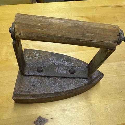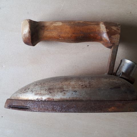 Mainos sähkörauta, jossa musta kahva ja metallinen runko. Silitysraudan pohja on metallia. Laite on tarkoitettu vaatteiden silittämiseen.