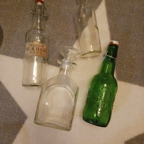 Chlas Ohlssonista ostetut lasipullot ja metslliset tarjoilukorit. Pullot ehjät. Osa korkkien tiivisteistä hävinnyt, mutta toimii käytössä hyvin ilman niitäkin.