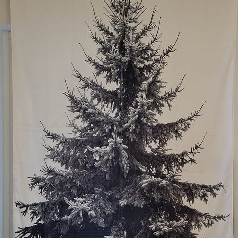 Joulukuusiverho, takapuolella ripustuslenkkejä, joihin voi pudottaa led-valot (ks. 2. kuva), niin näyttää kuin kuusessa olisi valot ja luo ihanan tunnelman. Käytetty yhtenä jouluna, hyväkuntoinen.