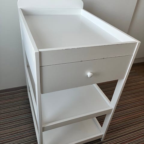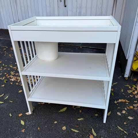 Hyväkuntoinen, laadukas, harmaa Little Footprint/Jollyroom hoitopöytä, joka muuntuu lipastoksi päällyosan irrottamalla. Laadukas ja tukeva puinen huonekalu. Sisällä kaksi hyllyä. Maalipinta parista kohdasta vähän kulunut (katso kuvat), mutta yleisilme kuitenkin siisti.