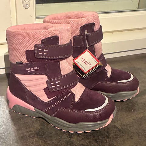 Myydään Superfit lasten talvikengät pojille, koko 36. Kengät ovat mustansiniset ja niissä on tarrakiinnitys.