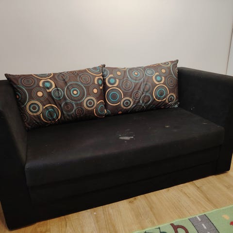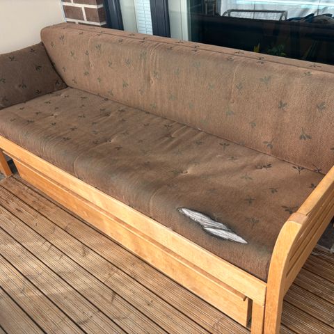 Vuodesohva vuodevaatelaatikolla, vuoteen mekanismissa joku häikkä. Kuvassa ei toista käsinojaa mutta se löytyy. Kankaat ehjät.