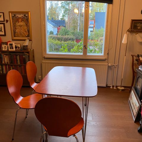 Fritz Hansen-tyylinen tuoliryhmä. Tuoleissa pieni naarmuja, mutta muuten hyvässä kunnossa. Myydään vain kaikki yhdessä.