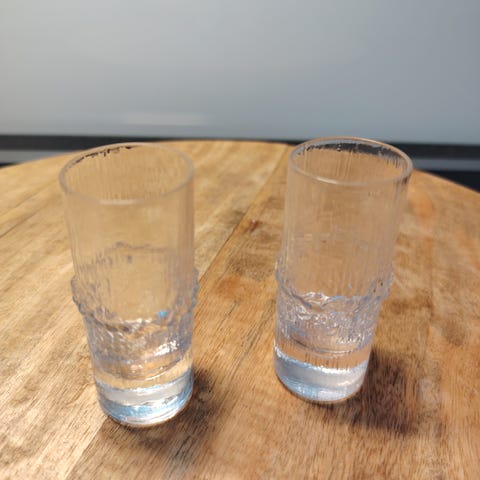 Kauniit Niva snapsilasit 3 Cl . Tarrat kuluneet ajan myötä, muuten virheettömät. Korkeus 75 mm ja halk. n. 30 mm. Kuusi kappaletta tarjolla.