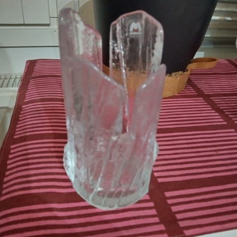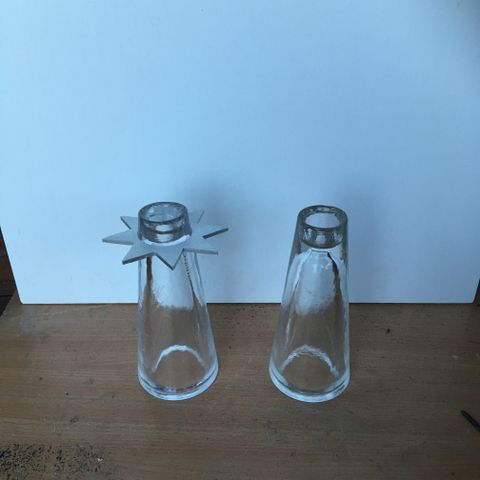 2kpl Muurlan jäätorni kynttilänjalkoja. Toinen isompi, toinen pienempi. Pienemmässä tasaisempi kuvitus pinnassa, isommassa on toisella puolella vähemmän. En tiedä onko alkuperäinen vai joku itse tehnyt. Hinta yhteensä!