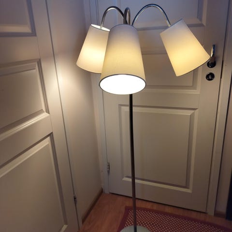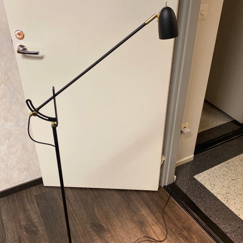 Valaisinliikkeessä esillä ollut musta jalkalamppu. Korkeutta mahdollista säätää, korkeimmassa asennossa 167cm. Varjostin vielä muoveissa. Poltin E27. Katkaisija johdossa.