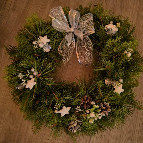 Aidoista havuista ja mustikanvarvuista tehty. Ripustuslenkki takana. Nouto myös Nokian harjuniitystä sovitusti.