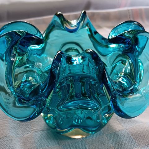 Muranon valmistama painava paksua lasia oleva taidelasi malja. Väri siniharmaa. Kunto virheetön. Korkeus 8.5 cm leveys 15.5cm.