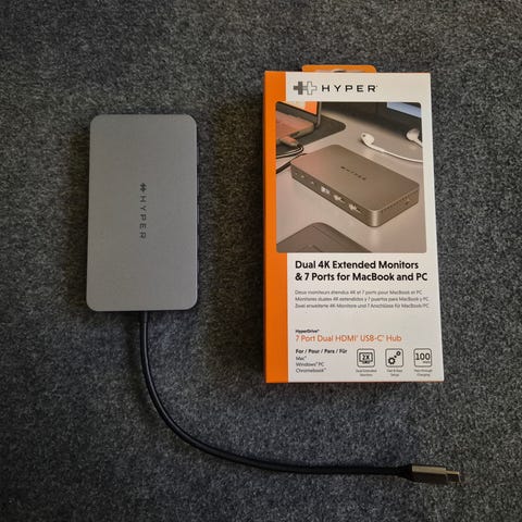 11-porttisen Hyper HyperDrive Next USB-C -hubin ansiosta voit laajentaa kannettavasi liitettävyyttä. Siinä on 2 HDMI-porttia 60 Hz 4K-tuella, USB-C-portti 140 W Power Delivery -tuella, 2 ylimääräistä USB-C-porttia, 2 USB-A-porttia ja Ethernet-portti.