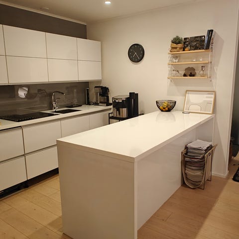 Koot 63x209cm ja 63x80cm. Isommassa palassa takareunassa kaksi koloa. Etureuna pyöristetty.