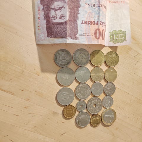Seteleitä ja kolikkoja, tulleet kotiin matkoilta ja jääneet lipastoon.