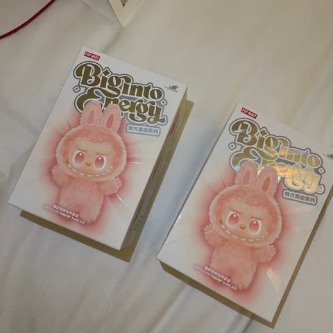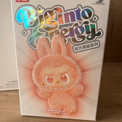Kuvan avaamaton big into energy -paketti, sisältää yhden toisessa kuvassa näkyvistä Labubuista. Paketti avaamaton eikä siis tietoa, mikä Labubuista tässä paketissa on.
