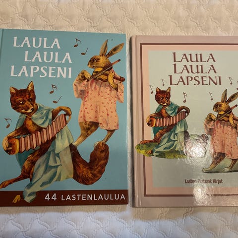 28 lastenlaulua sanoineen, nuotteineen, sointumerkintöineen ja leikkiohjeineen. Toisessa kuvassa luettelo lauluista.