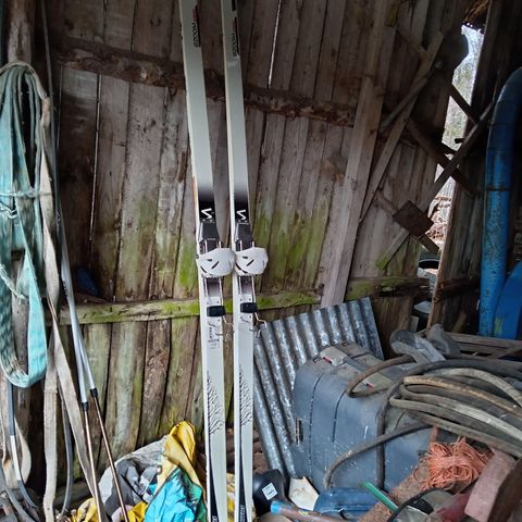 Ylösen 220 cm ja 8,2 cm leveät eräsukset siteineen.