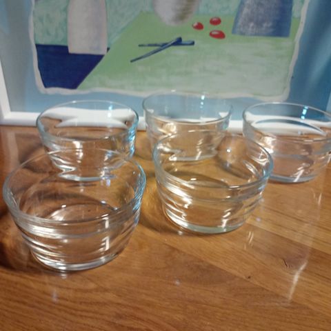 Kirkkaan värisenä löytyy tarjoilukulho 20€ ja 5x jälkiruoka kulhot 5€ / kpl.
