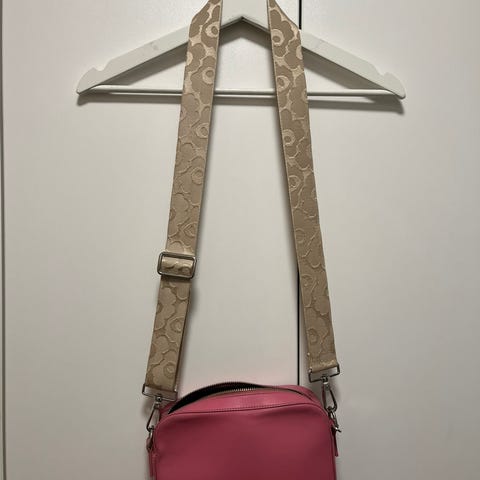 Marimekko nahkainen laukku, unisex-malli. Laukussa on musta nahkapinta ja vetoketjukiinnitys. Olkahihnassa näkyy Marimekon logo. Laukku soveltuu arkikäyttöön ja pienten esineiden kuljettamiseen. Siisti ja vähällä käytöllä ollut.