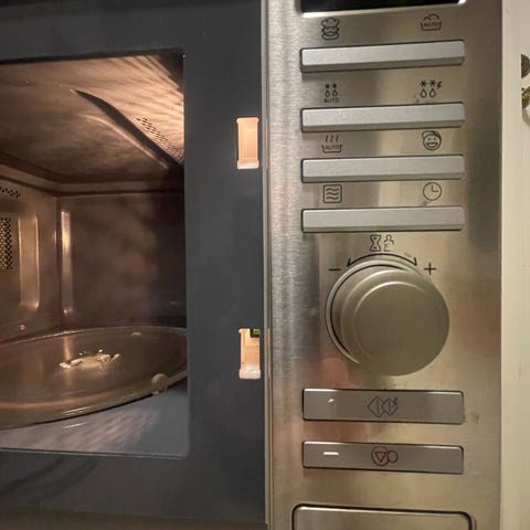 Samsung mikroaaltouuni valkoisella värillä. Laitteessa on musta etupaneeli ja valkoinen runko. Sisältää pyörivän lasilautasen ja kaksi säätönuppia. Soveltuu ruoan lämmitykseen ja sulatukseen.