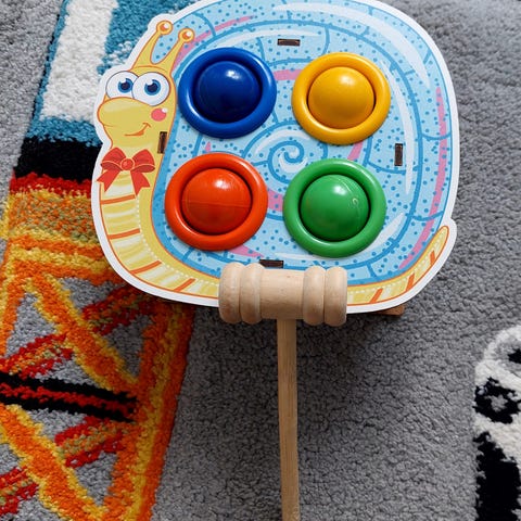 Ehjä ja siisti. Palat saa irti ja toimivat myös helistiminä. Vasara kiinni narulla.