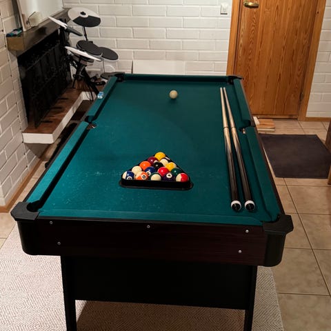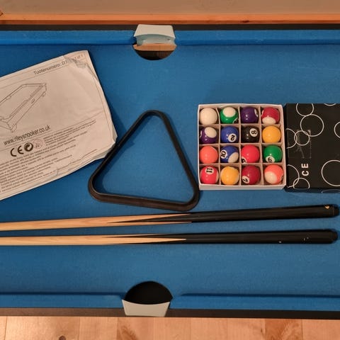 Myydään käytetty lasten biljardipöytä. Koko 153x82 cm. Kaksi pallosarjaa, kahdet kepit ja muita varusteita.